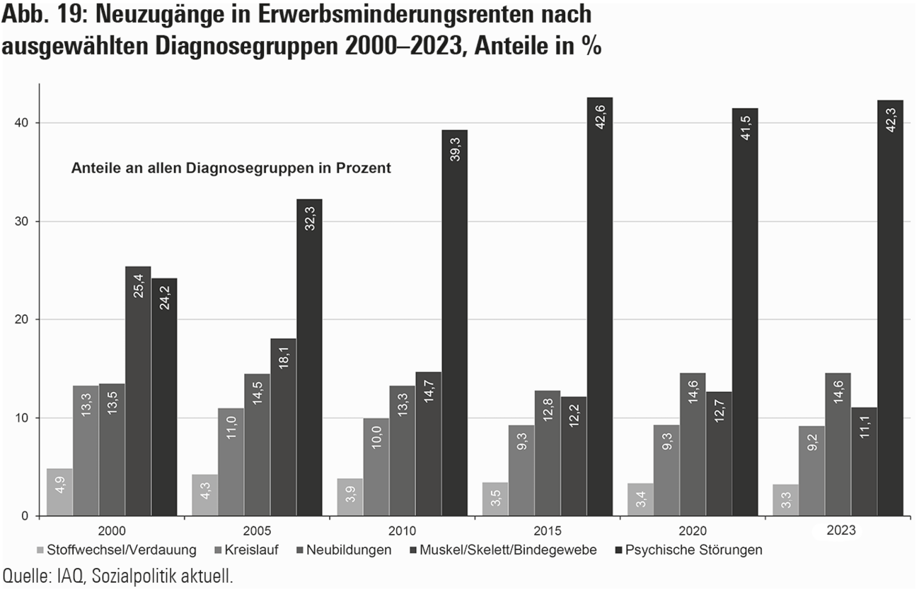 Großen Anteil am vorzeitigen Ausscheiden Älterer aus dem Erwerbsleben haben die psychischen Belastungen. Seit etwa 2005 sind sie – mit wachsendem Abstand – die wichtigste Krankheitsart, die den Zugang zu EM-Renten verursacht. Inzwischen machen sie rund 42% der Diagnosegruppen aus (Abb. 19).