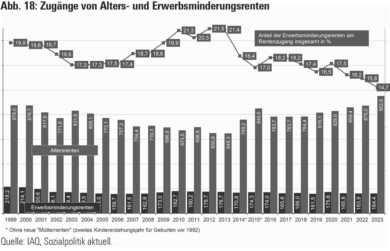 • Brussig, Martin: Erwerbsminderungsrenten im Altersübergang: Entwicklungstrends in einem Umfeld steigender Altersgrenzen. IAQ Altersübergangsreport 2025/01
