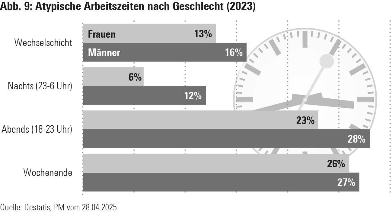 Die zur Verfügung stehenden Daten zeigen, dass jetzt schon und auch schon seit langer Zeit flexible und somit zumeist atypische Arbeitszeiten weit verbreitet sind und zum Neuen Normal dazugehören. Die Daten des Mikrozensus belegen: Mehr als ein Viertel der abhängig Beschäftigten (27%) hat im Jahr 2023 häufig oder gelegentlich am Wochenende gearbeitet. Der Geschlechterunterschied war dabei gering: Männer 27%, Frauen 26% (Abb. 9). Auch Arbeit am Abend kennt gut die Hälfte der Beschäftigten. Und fast ein Drittel (29%) arbeitet in Wechselschicht.