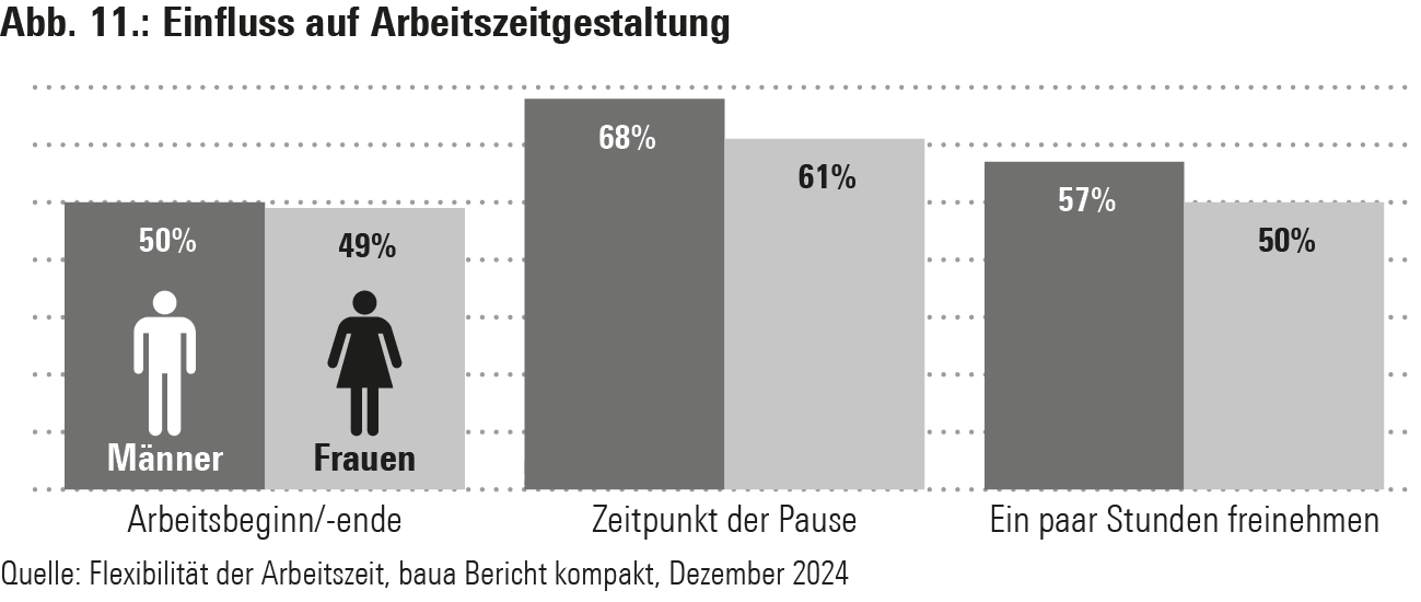 Neben Wochenendarbeit ist vor allem das Arbeiten am Abend für rund ein Viertel der Beschäftigten ganz normal. Wenn Arbeitszeiten in hohem Maße atypisch und flexibel sind, hängt die Arbeitsqualität u. a. davon ab, in welchem Maß die Beschäftigten hier über Autonomie verfügen, also Beginn, Ende, Pausen usw. selbst bestimmen können. Die Daten der BAuA-Arbeitszeitbefragung 2023 zeigen u. a., dass Vollzeitbeschäftigte hier mehr Autonomie haben als Teilzeitbeschäftigte und Männer mehr als Frauen. Dennoch können große Anteile der Beschäftigten hier nicht selbst entscheiden.