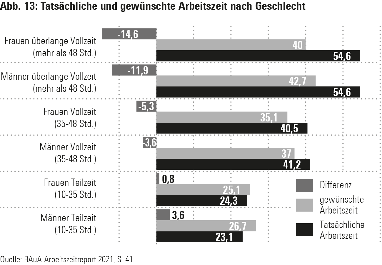 Es bleibt auch unerlässlich, die Beschäftigten selbst zu fragen, welche Arbeitszeiten sie sich wirklich wünschen (eine Frage, die Politik und Arbeitgeber sicherheitshalber gar nicht stellen). Dann zeigt sich durchgängig und seit Jahren eine große Diskrepanz zwischen Wunsch und Wirklichkeit (s. beispielhaft Abb. 13).