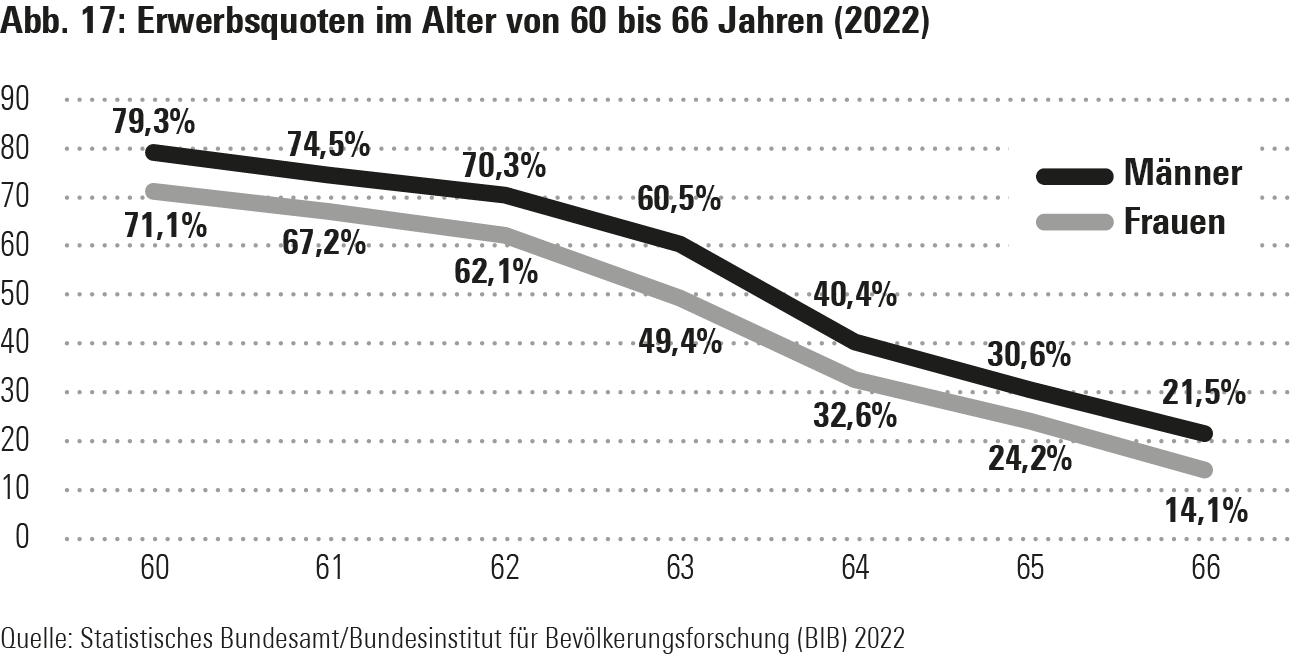 Mehr als die Hälfte der Befragten (53%) glaubt also nicht, bis zur Rente durchhalten zu können. Gleichzeitig gaben 51% an, ein Renteneintrittsalter zwischen 60 und 63 Jahren anzustreben. 11% wollten sogar in einem Alter unter 60 in Rente gehen. Bis maximal 67 Jahre arbeiten wollten nur 27%. Drei Viertel der Befragten konnten sich nicht vorstellen, über das 67. Lebensjahr hinaus zu arbeiten. Die Realität entspricht dem. Abbildung 17 zeigt: Etwa bis zum Ende des 62. Lebensjahres sind die Erwerbstätigenquoten bei Männern und Frauen noch relativ hoch. Dann sinken sie rapide ab, und die Mehrheit der bis dahin Beschäftigen scheidet aus dem Arbeitsleben aus.