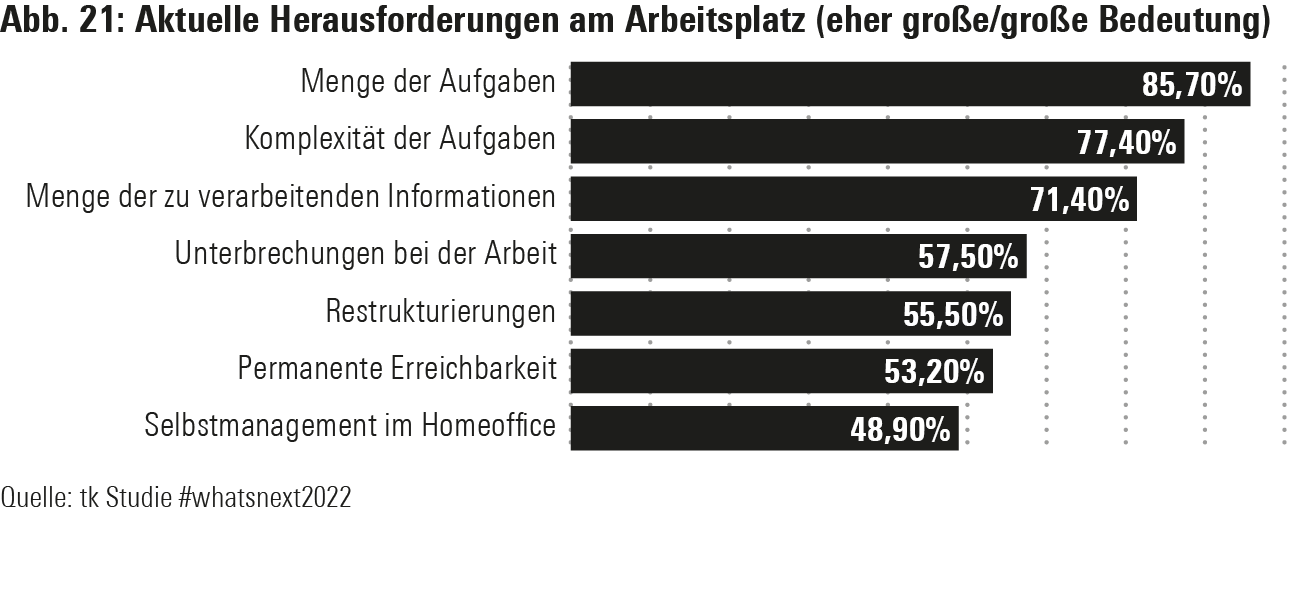 Aufschluss über den wirklichen Zusammenhang zwischen Belastungen und Beanspruchungen am Arbeitsplatz und dem Krankheitsgeschehen gibt aber z. B. eine aktuelle Studie der Techniker Krankenkasse (www.tk.de/presse). Hier wurden Ende 2022 knapp 1100 Geschäftsführende und Gesundheits- und Personalverantwortliche gefragt, welche besonders großen Herausforderungen sie im Zusammenhang mit der Gesundheit und Leistungsfähigkeit der Beschäftigten sähen (Abb. 21).